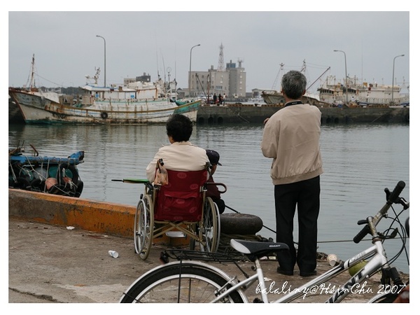 這不是我第一次到南寮漁港,但沒有一次是有出太陽…所以我對南寮的印象總是陰暗的、灰灰的、風很大、空氣中雜著烤香腸的氣味。在漁港旁的建築物前面,有一排小市集,熱熱鬧鬧地好像來到士林夜市金雞廣場前面,用棒球丟九宮格的遊戲攤子、撈魚的(嗯…看到一個小妹妹撈地很"用力"…魚應該是用飛的到她的盆子裡…)、投籃機、賣風箏的、賣煙火仙女棒的、當然還有賣烤香腸的…逛完之後,只有一個感想,就是…餓…畢竟我們第一個行程並沒有實現…