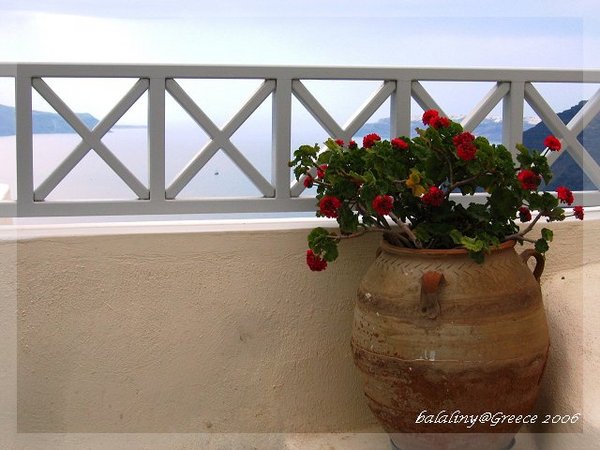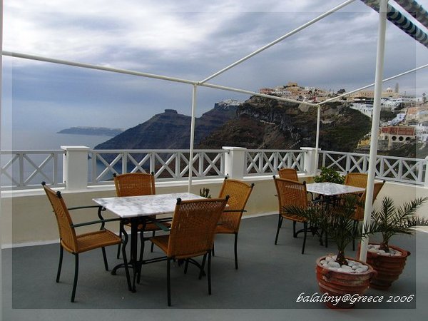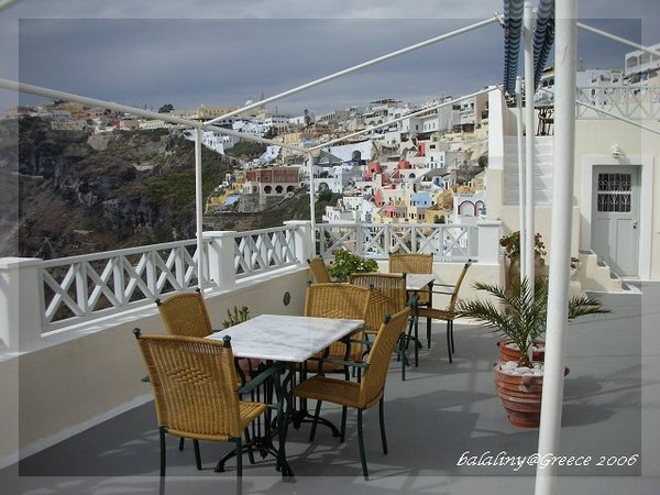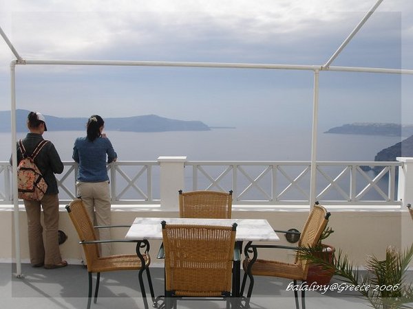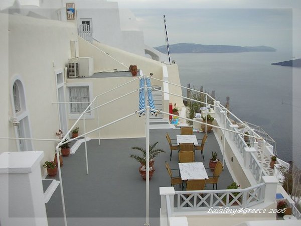 在自家陽台上就可以看到愛琴海無敵海景及臨崖而建的Fira城