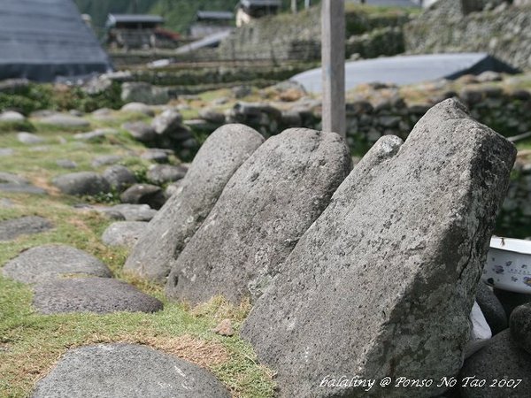 (傳統地下屋前的靠背石,以前達悟人一家子就在這邊開家庭會議)