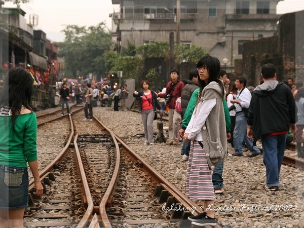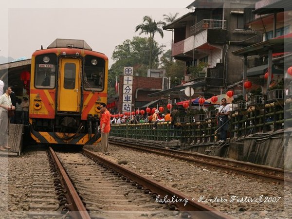 為了配合火車班次,我們先在十分下車後等待往菁桐的列車,然後再折返至平溪,最後回到十分看放天燈。在四處都是遊客的情形下,也只是隨意晃晃就走回月台。火車即將進站時,台鐵的工作人員便吹起哨子提醒行走在鐵道上的遊客,由遠而近,一連串的哨子聲伴隨有人呼喊著"火車來了~"。平常也許會覺得鐵路平交道就代表著危險,但在這邊,火車及鐵道親近得就像生活的一部份,不再望而生畏。