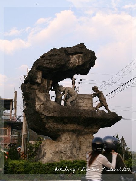 (菁桐的地標,礦工紀念石刻。烏雲才剛散去的天空是輕淡的藍。)
